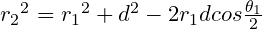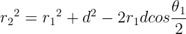 여기서 삼각형 O₁O₂P의 길이를 모두 알고 있으므로 코사인 제 2법칙을 이용하여 다음과 같은 식을 만들 수 있다.
