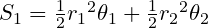 두 부채꼴의 중심각 θ₁, θ₂를 모두 구했으니, 반지름과 중심각을 이용하여 부채꼴과 삼각형의 넓이를 구할 수 있게 되었다. S₁가 두 원에서 만들어진 부채꼴의 넓이의 합이고, S₂가 두 원에서 만들어진 삼각형의 넓이의 합이면 다음과 같이 식을 쓸 수 있다.