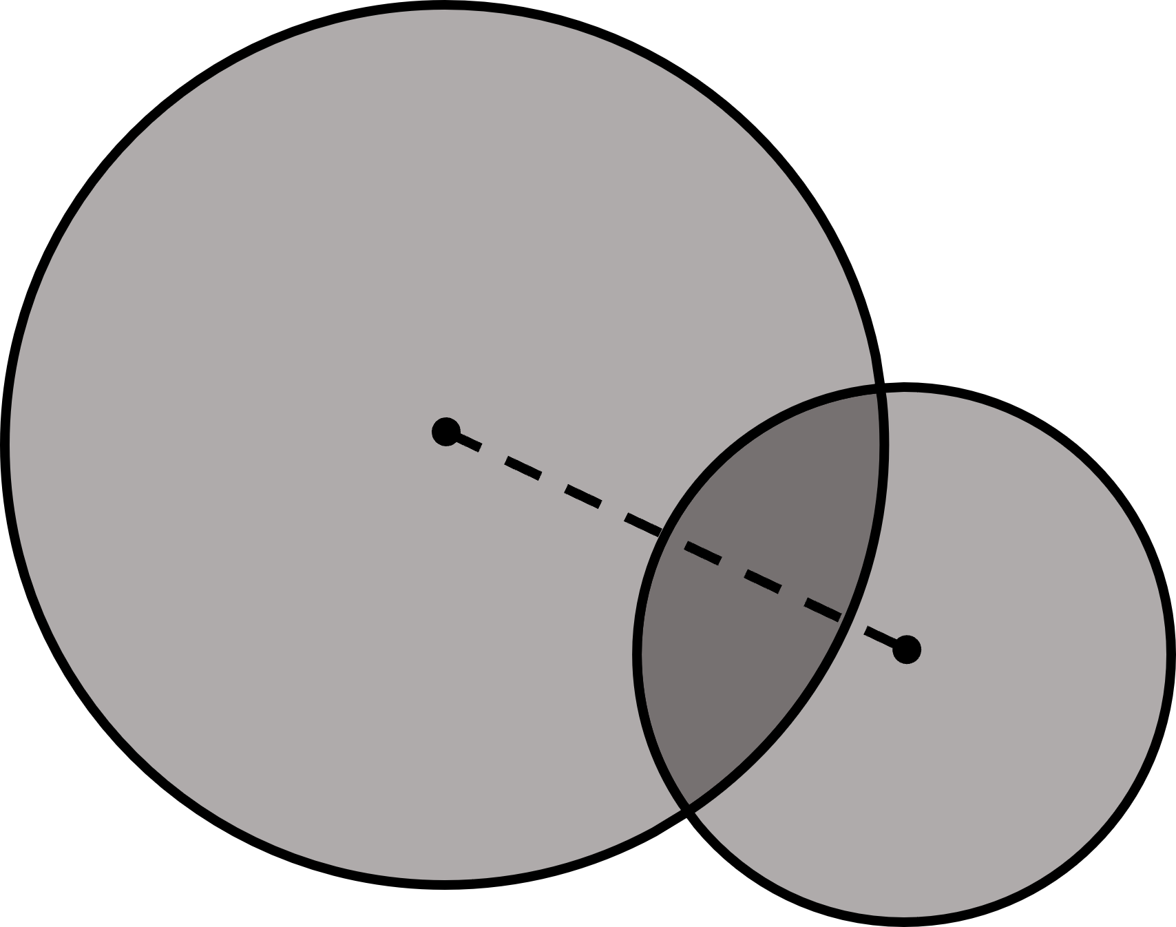 이 때, 두 원은 호 PP'를 가지는 부채꼴과 원의 중심과 점 P, P'을 꼭짓점으로 가지는 삼각형을 만들 수 있다. 여기서 두 원이 교차하는 영역의 넓이를 부분을 구하려면 각 원에서 만들어진 부채꼴의 넓이에 삼각형의 넓이를 뺀 넓이를 서로 더하면 된다.