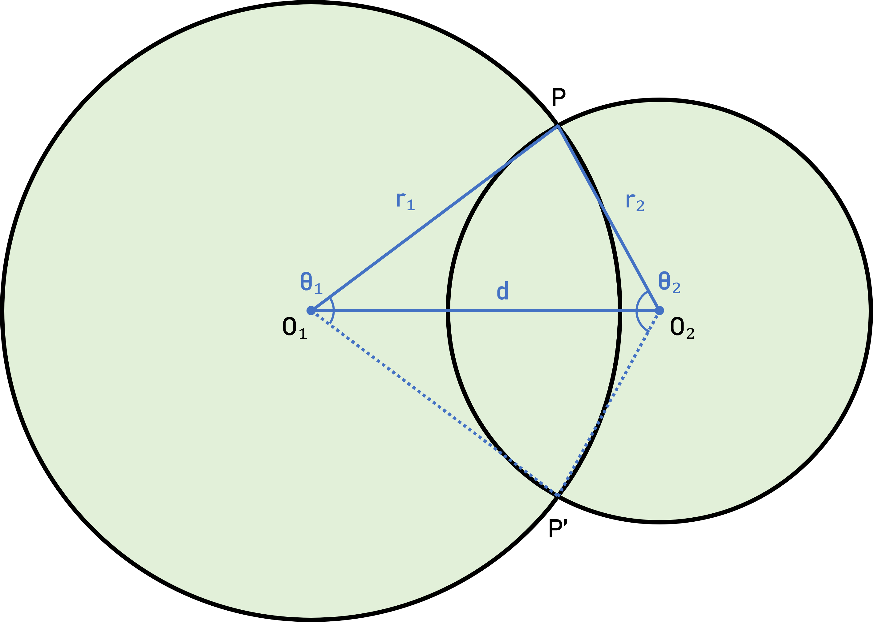 먼저, 위와 같이 삼각형 O₁O₂P와 삼각형 O₁O₂P'을 만들 수 있다. 이때, 선분 O₁O₂의 길이는 두 원의 중심의 거리 d이고, 삼각형 O₁O₂P와 삼각형 O₁O₂P'는 세 변의 길이가 모두 같은 SSS 합동이므로 각 PO₁O₂의 크기는 θ₁ / 2 이다.