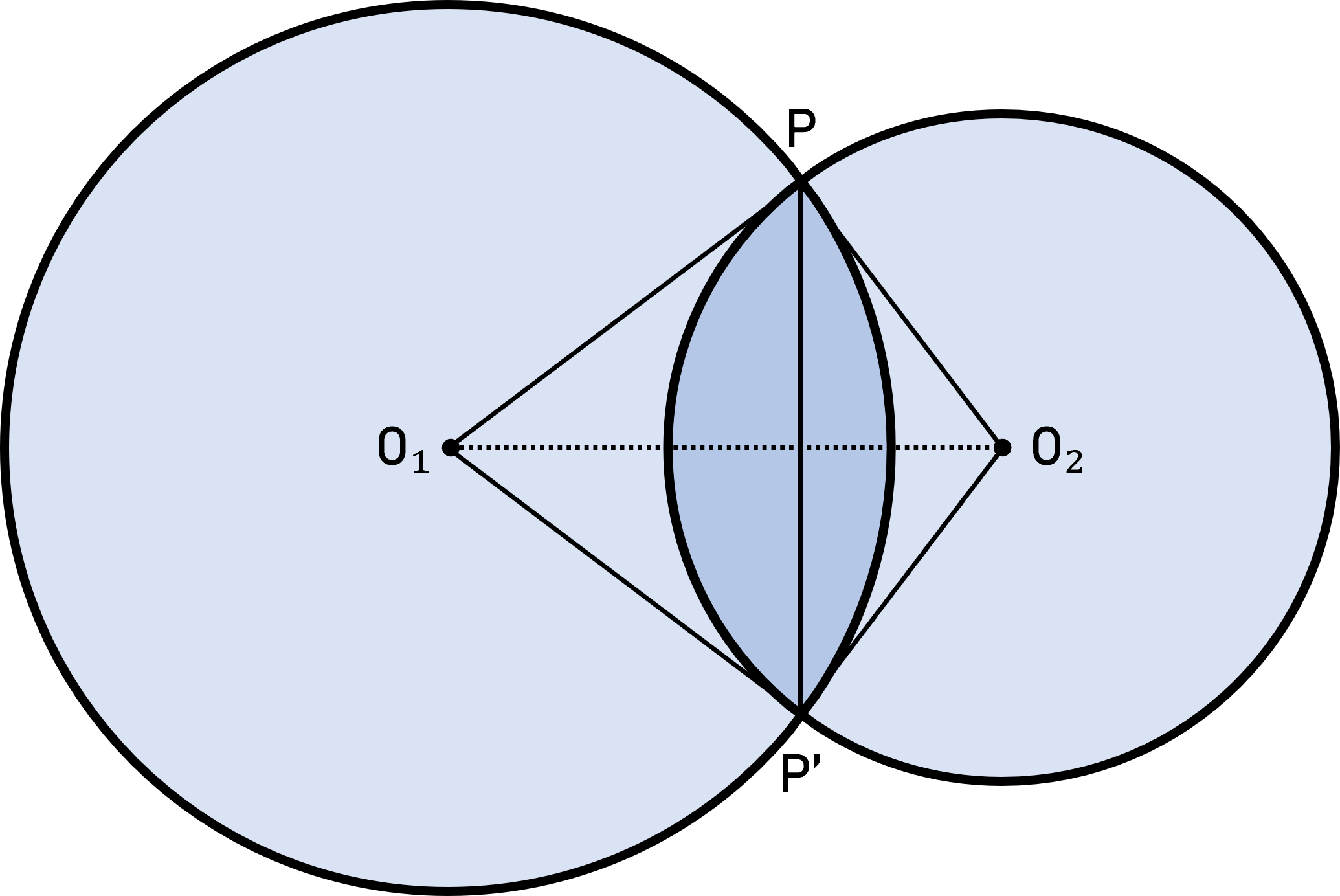 먼저, 두 원의 중심을 각각 O₁, O₂ 라 하고, 두 원의 테두리가 만나는 두 점을 각각 P, P' 라고 하면 다음과 같이 선분 O₁P, O₁P', O₂P, O₂P', PP' 를 만들 수 있다.