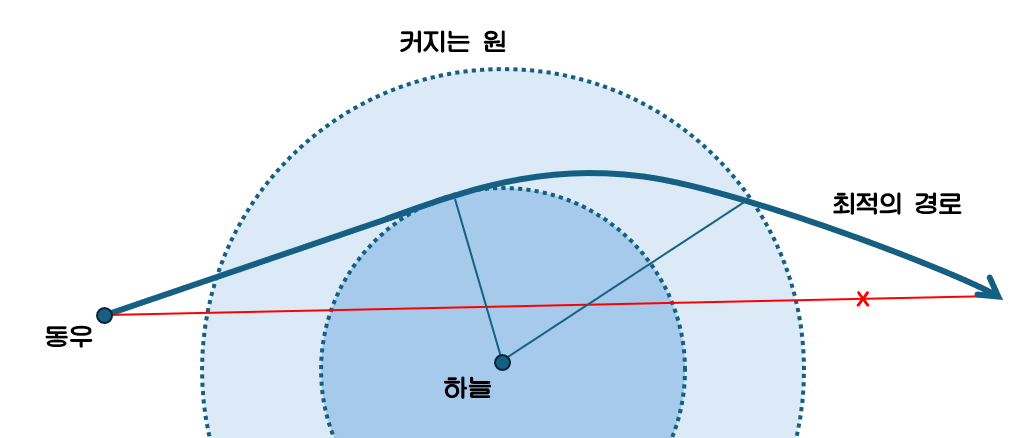 이 때, 원의 중심 $O = (\frac{lv^2}{v^2-1}, 0)$, 반지름 $r = \frac{lv}{v^2-1}$ ($l=$동우와 하늘이의 거리)
